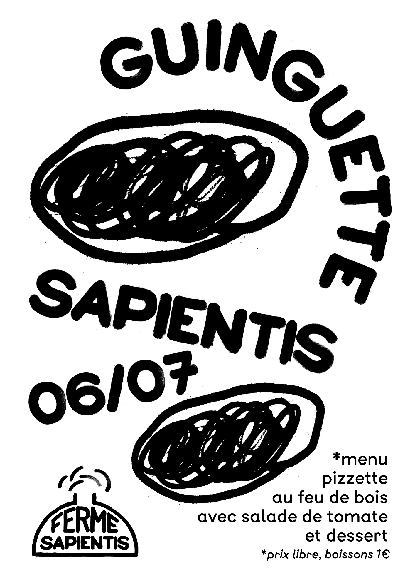 Mise en place d'un système d'identité pour l'association Ferme Sapientis à Verfeil. Typographie personnalisée, logo, déclinaisons et peinture de panneaux à la main sur site.